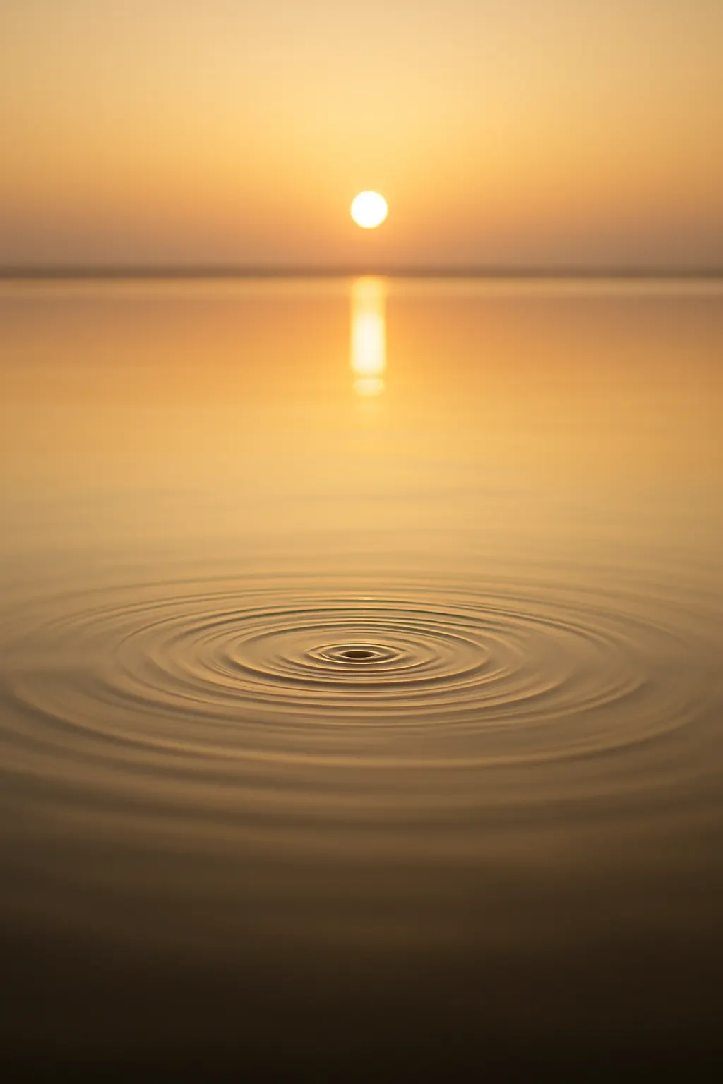 A softly lit photograph of a single ripple expanding across calm water at sunrise. The light is warm and golden, symbolizing the quiet strength of authenticity and the ripple effect of presence.