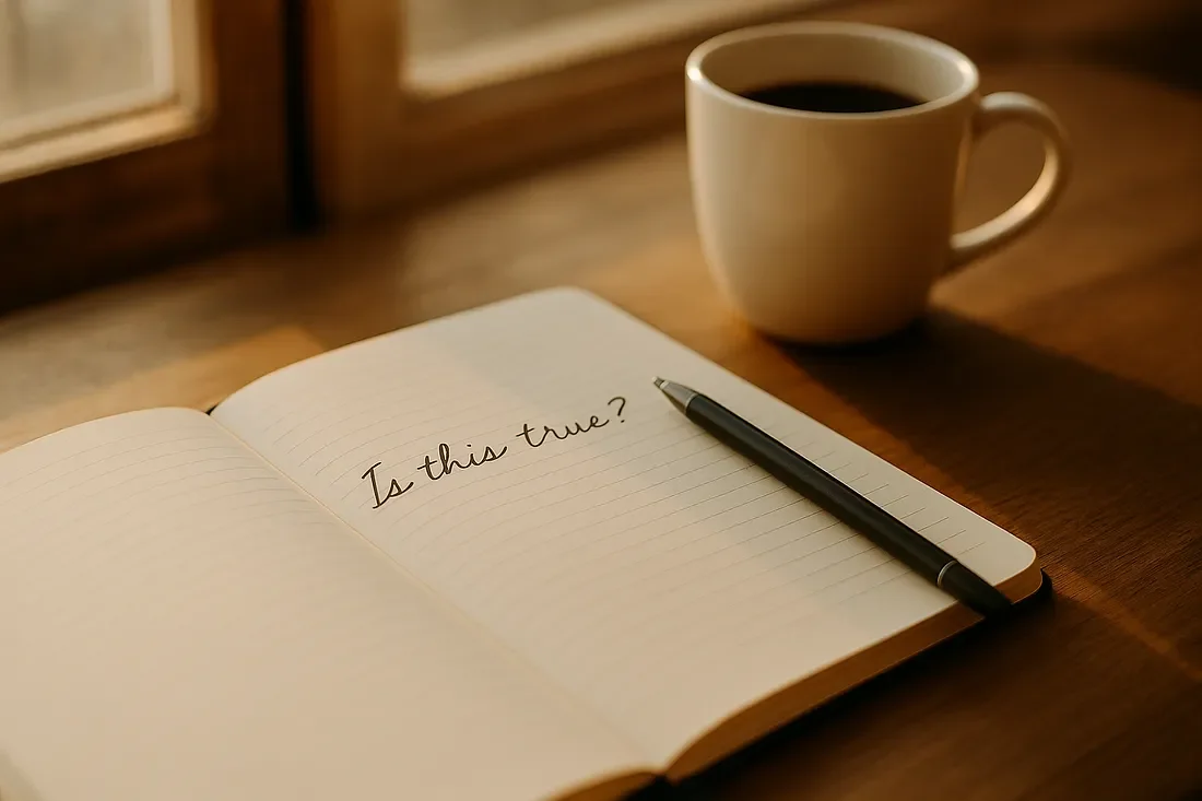 A softly lit morning scene. A wooden desk near a window. A notebook open with the words “Is this true?” written in elegant handwriting. A pen rests beside a cup of coffee. The sunlight is warm, the moment feels quiet and grounded, a pause before honesty.